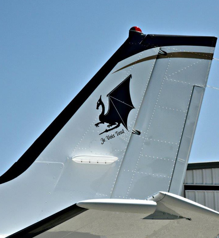 Just one look at the tail of Deubler’s Beechcraft Baron G58 aircraft shows how much fun he’s having in the air: a graphic inspired by the movie Eragon, a mythical story about a dragon flyer. Under it, a line from another movie, Flyboys—Je Vois Tout—French for “I see all.”