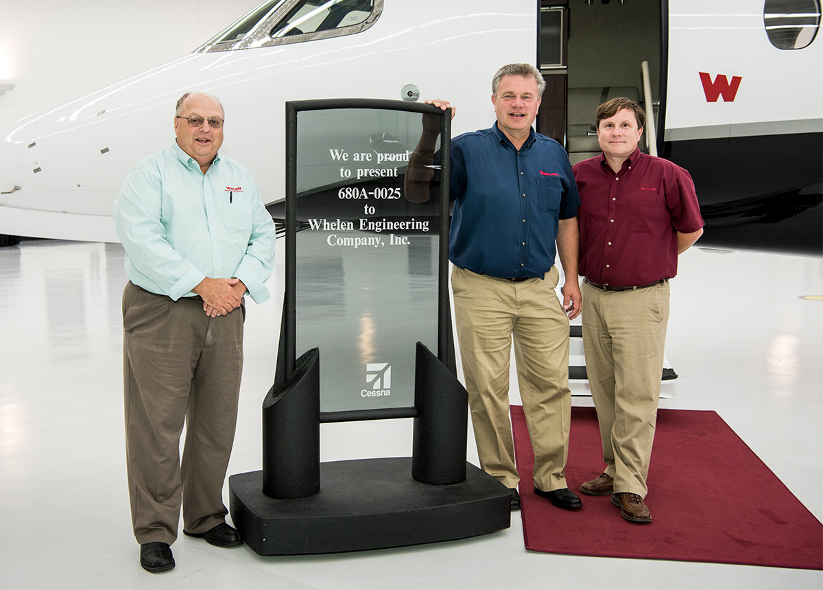 Whelen Engineering pilots Dennis Piscitello, James Olson and Greg Ginnetti in front of the company's Citation Latitude jet.