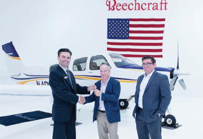 Andy Segall (center), CEO and José R. Santana (right), Senior Vice President of Retail Sales & Leasing and Chief Pilot, receive the keys to a milestone aircraft, the 4,000th Model 36 Beechcraft® Bonanza®, from Alex Chisholm (left), Beechcraft Regional Sales Director.