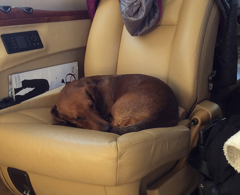 The dachshund sisters, Sophie and Brandy, are the perfect example of how each dog reacts differently to flying. Brandy takes a low dosage of an anti-anxiety drug and wears earmuffs during the flight. Sophie takes no medication and won’t wear anything covering her ears. Both like to be on an owner’s lap or sleeping under a familiar blanket during the flight.