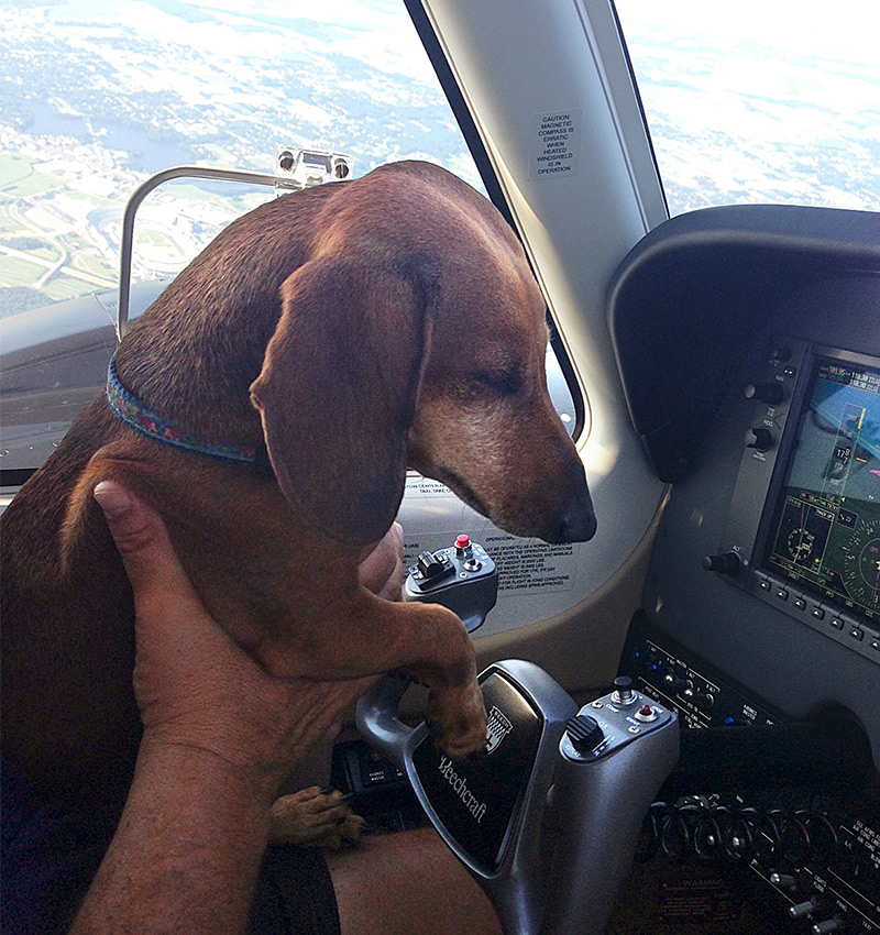 Sophie, a miniature dachshund, at the controls of the Beechcraft Baron G58 her owners previously flew.